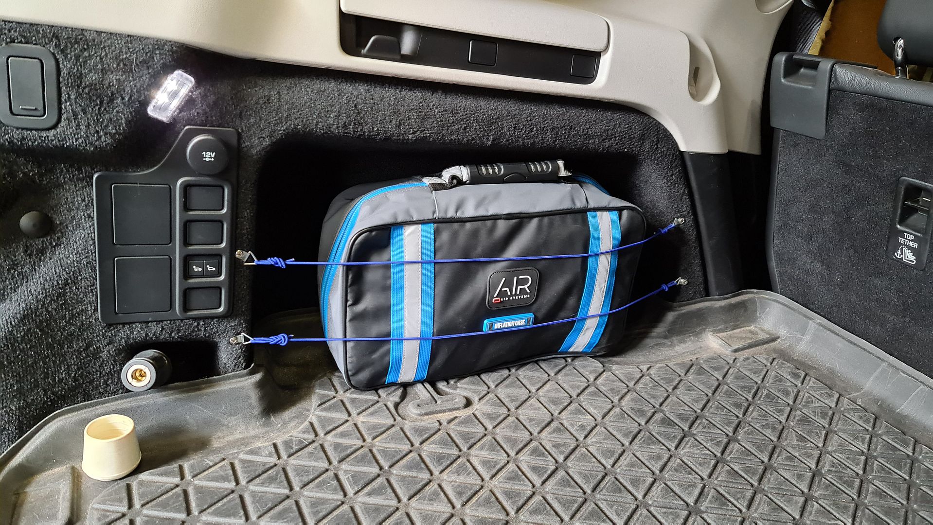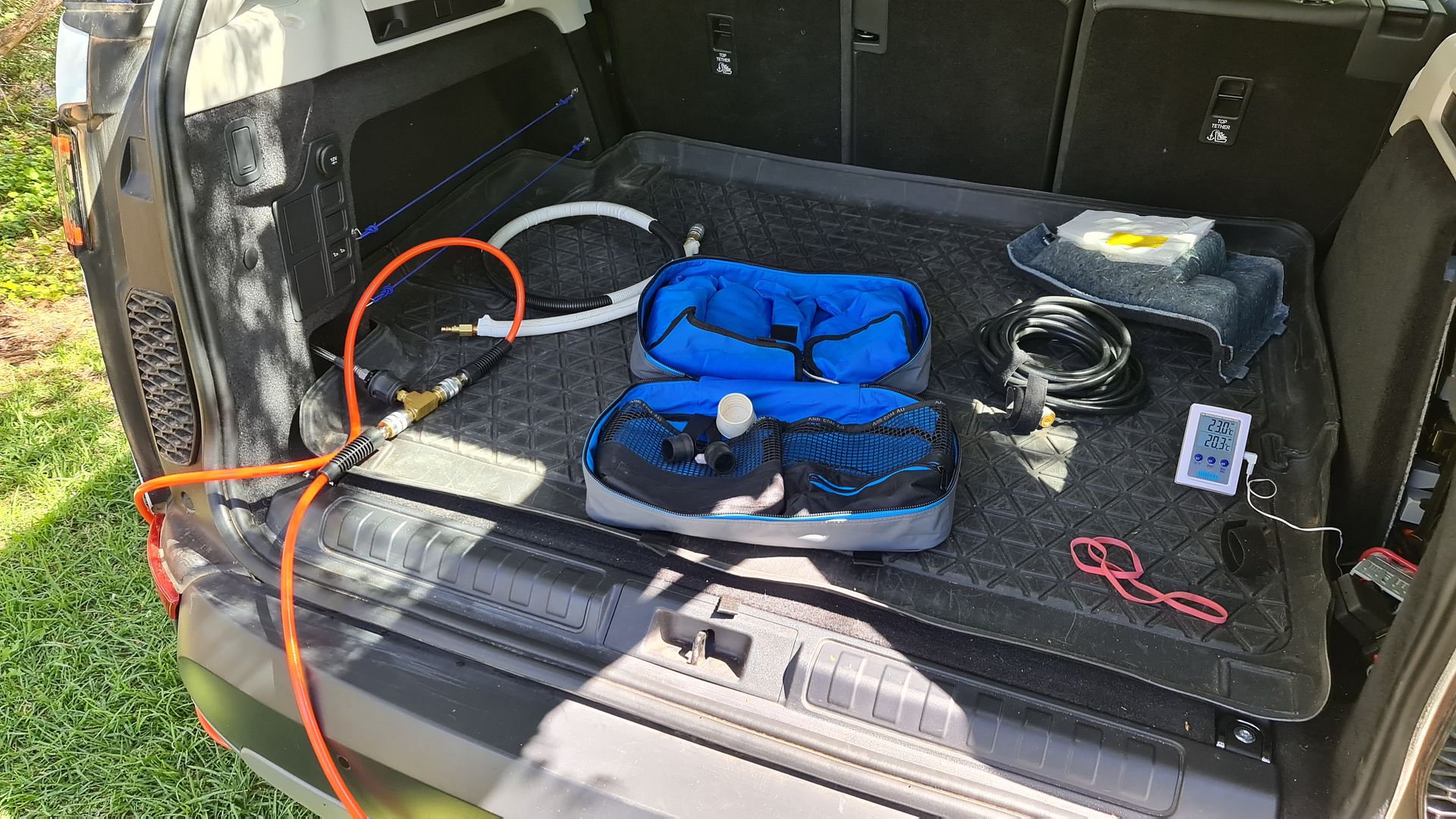Also, the air line comes out at the jack storage space, which works for me. I have a 1.5 metre extension and a T piece so I can plug two hoses in and inflate/deflate two tyres at a time, front, rear or camper trailer.