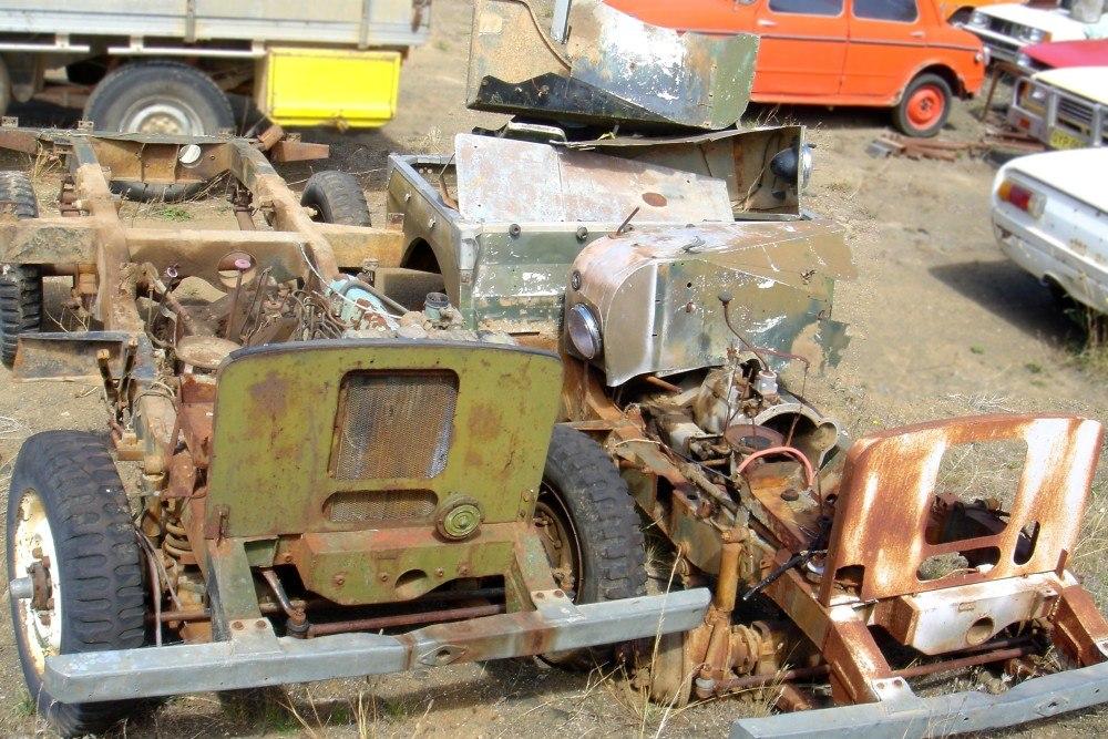 Here's a pic from Cooma's Landy graveyard. Both chassis have a few front-end mods, one has coil springs, both have homemade radiator panels. SMHEA custom jobs? Spotted any other clues?