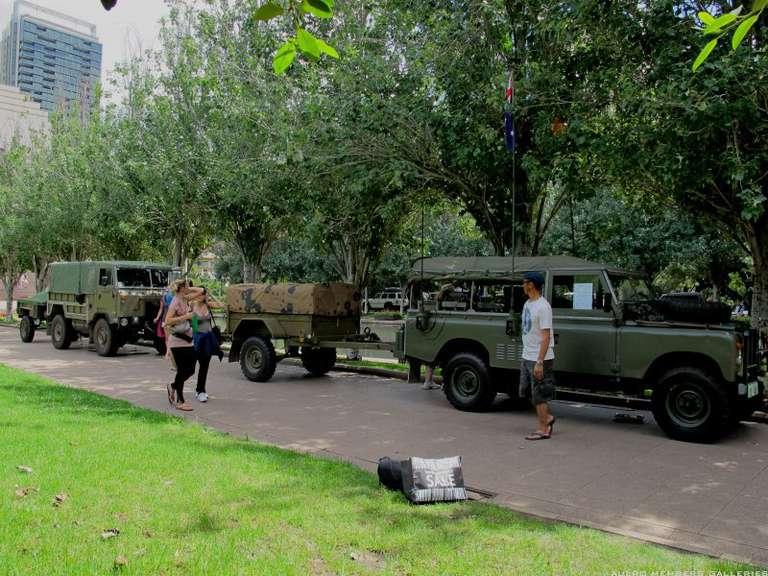 There were thirteen Land Rovers and seven Toyota Landcruisers (organised through the Toyota Landcruiser Owners Club of Australia) in Hyde Park South near the Pool of Reflection in front of the Anzac Memorial. There were other military vehicles from the Australian ex-Military Vehicle Collectors Society (AMVCS) and World War II Jeeps between the Pool and Park Street. An 80" Land Rover was also displayed with Illawarra Vintage Car Club in the main Motorfest in Macquarie Street.