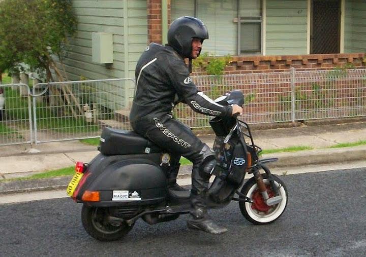 He wasn't worried about riding with anyone. He owned a rat Vespa, too, but here it's his Honda 350-Four cafe racer.