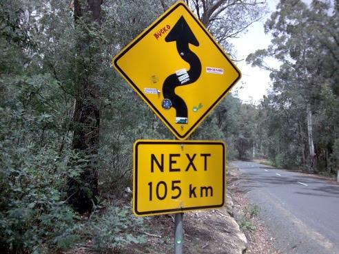 A sign we found on one of his favourite roads, the Bonang Way - someone had stuck up a Bucko sticker which were produced after his death.