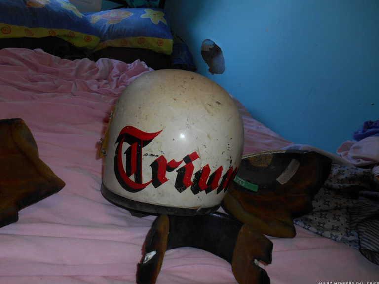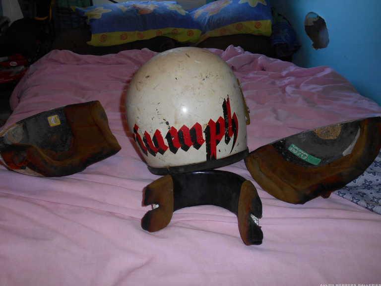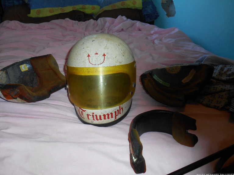I'm going to get the sponge covers and sponge lining restored/replaced and some new leather around the chin strap, will repaint it and get a pinstriper/signwriter to re-do the Triumph and Trident decorations.
