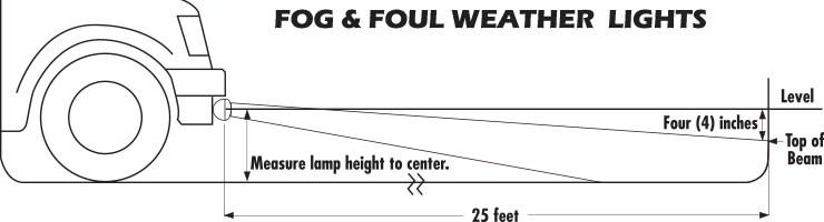 The lamp is mounted as low as possible and is pointed down 4 inches in 25 ft (101mm in 7,620mm) so if the light is at (say) 200mm off the ground on a city car, the light is aimed about 14m in front of the vehicle.