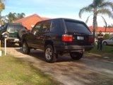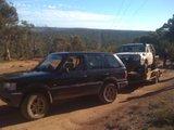 With the new found funds to modify, it wasn't long before the bug hit and things started changing. First, I was due for some new tyres, so I bought a set of 265/65/18 Bridgestone Dueler HP's for the Hurricane rims. The only photo I have of these is towing my mates Navara off the track to safety after a snapped tie rod.