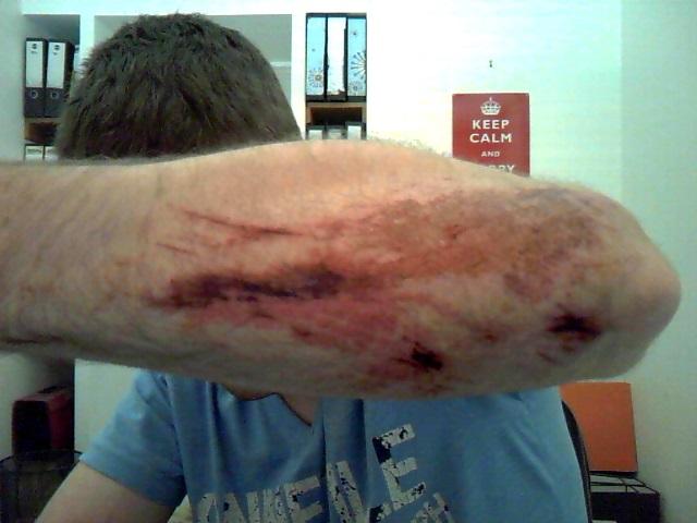 This was one arm after a huge off at Mt Joyce shuttling the downhill tracks. Both fore arms, left upper arm, left shoulder, left side, left hip etc etc all looked like this - probably worse tbh. The impact was so hard the edge of one of the buttons on my shorts got pressed into my leg and left a perfect sized slot!I also had a pretty severe instant headache and a black eye and I was wearing a full face helmet and POC knee/shin guards so it could well have been a lot worse! oh and a damaged finger!