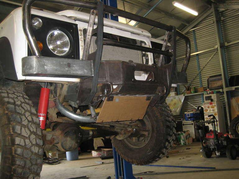 Thanks to Steve I ended up making a better steering guard to replace the standard builders trestle. I made it from gal pipe about 3mm wall thickness and is a similar design to the army perentie ones. I flatterned the ends with a sledge hammer which worked out better than welding tags on. I will bolt an ally plate to fill in between the steering guard and bottom of bull bar.