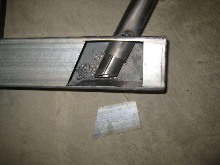 It was easier to set up the tubes on the vehicle to get the position right, but I couldn't access the inside of the bumper wing section until I pulled it off. The tubes wern't long enough anyway so I split a bit of 3mm pipe so it would be a nice tight fit, pre cut the angle on the end, and inserted it up the end of the bull bar tube. Then when the bull bar was off I could cut an access hole in the back of the bumper, pull the bit of pipe down with some vice grips so it meets the bottom of the bumper and can then weld it all up.