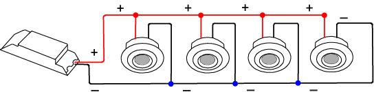 Parallel Connection is requiered, all RED(+) wires connected together and BLACK(-) wires with BLACK wires together.