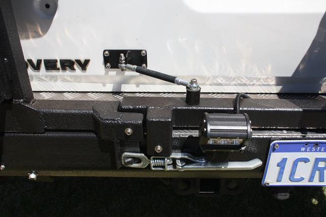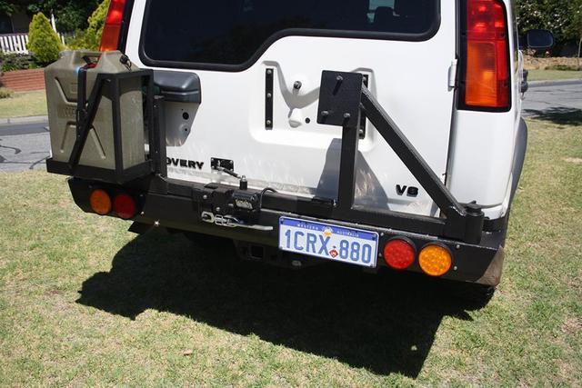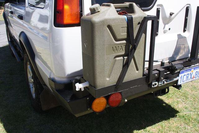Below you will see the new rear bar I fabricated. originally it was a second hand bar, but that was it.. just a metal 100x100mm box tub section, I forgot to get a photo of it when it was purchased. Many many hours of grinding/welding and painting down in the shed got it to what you see below. It has a neat little latch mechanism that attaches the right swing arm to the disco rear door, hence it only takes one action to get into the rear cargo area. It is sprayed with 2 litres of raptor liner for durability. Some cheapie ebay special LED lights finnish it off. With the amount of driving I do in Perth I really wanted some bright rear lights, and these LED's do the trick.. they are super bright.
