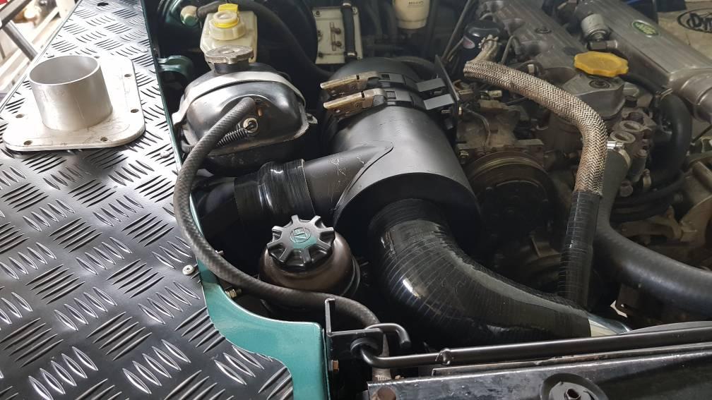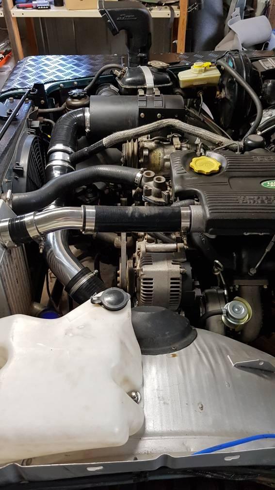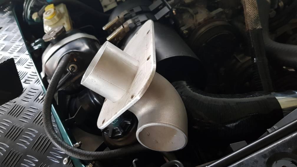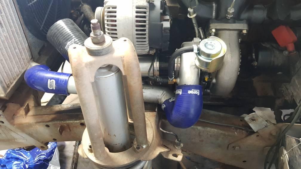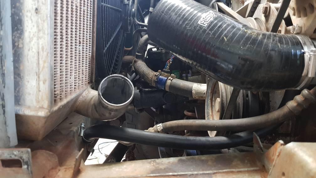 Finally the bottom intercooler connector is not ideally aligned, I would like to rotate it. The pipe from turbo to intercooler should run parallel to the chassis rail, leaving more space for the turbo inlet pipe that runs above it. As it is they are pressed on each other.