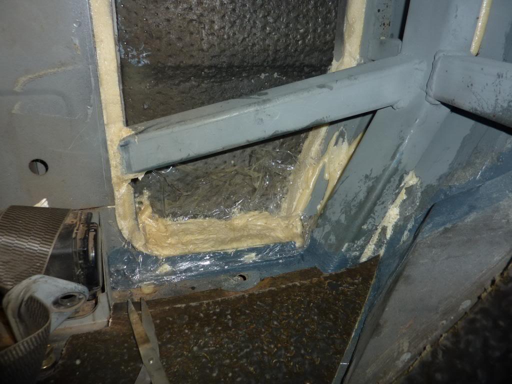 I was concerned that at the bottom of the rear quarter panel (ex rear door), moisture would accumulate and cause the steel to rust out. So I filled these areas with foam: