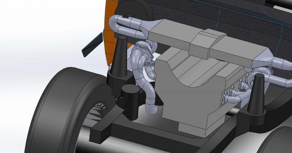 I've settled on the design of the turbo dump pipes. I have a problem on the right hand side where the tightest butt weld elbow available doesn't have a small enough radius and as a result it is going to foul on the compressor. I'll deal with that when it comes to building the pipe: