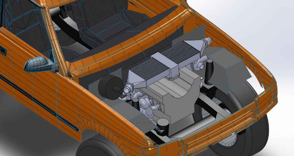 I spent a little bit more time tonight on the intake design. Unfortunately the brake master cylinder is in the way, so I've had to make a compromise on the right hand intercooler inlet tank.