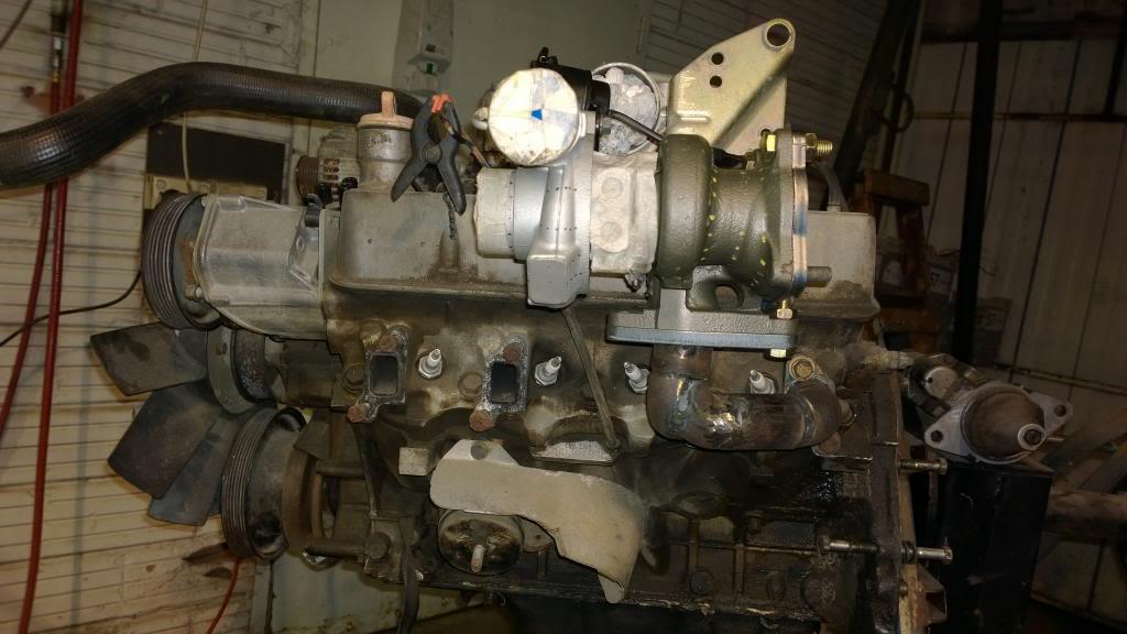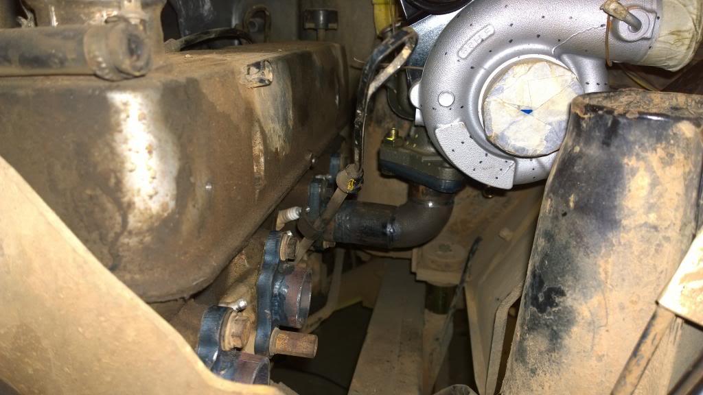 Next up, positioning the left hand turbo where I wanted it. I suspended it off a tube with some steel wire and got to welding up the first tube run to it:
