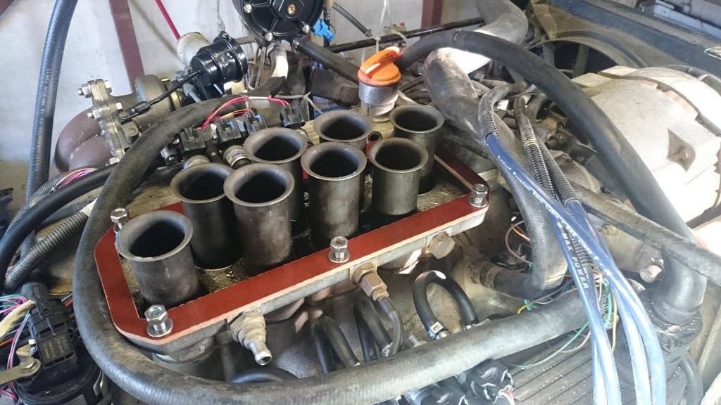 Derrick paid a visit and lent a helping hand which was greatly appreciated. The intercooler-plenum was bolted in place on the test engine along with the throttle bodies. I discovered that it was near impossible for me to reach the bolts connecting the plenum to the plenum base in the middle. There was simply too much in the way. Anyway, I think the assembly being bolted down in the corners will be fine.