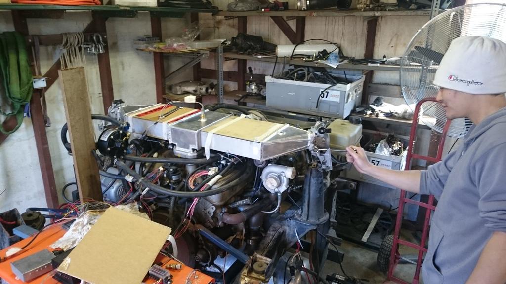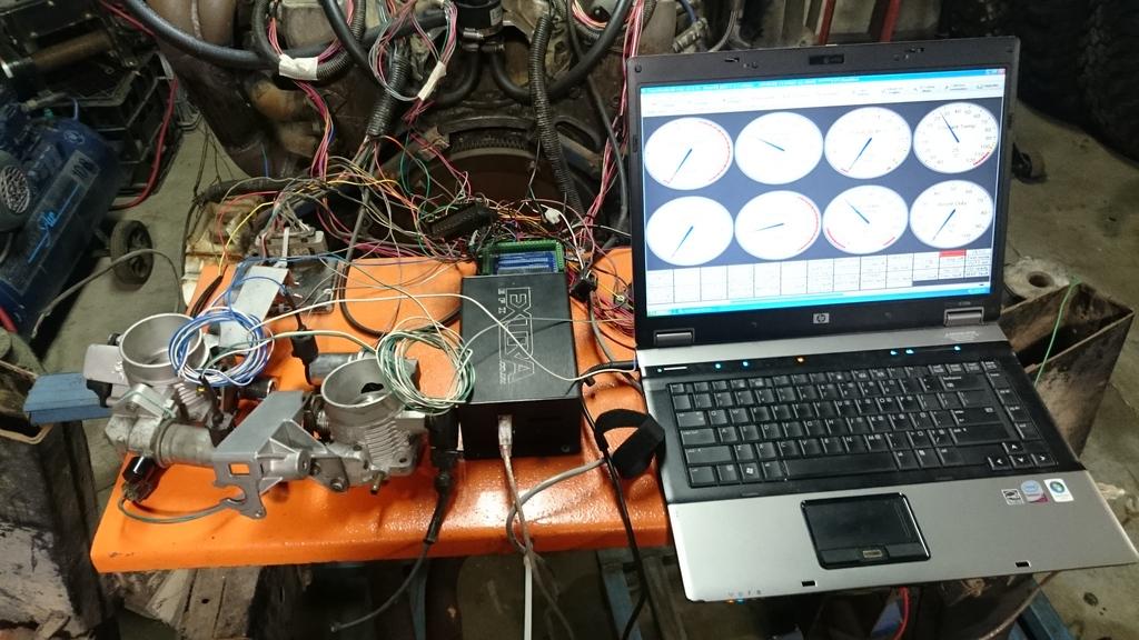 The engine was started with the turbos and intake system, and everything appeared to be fine. The idle control valves on the throttle bodies work, but more work is needed to set the controller to prevent oscillation.