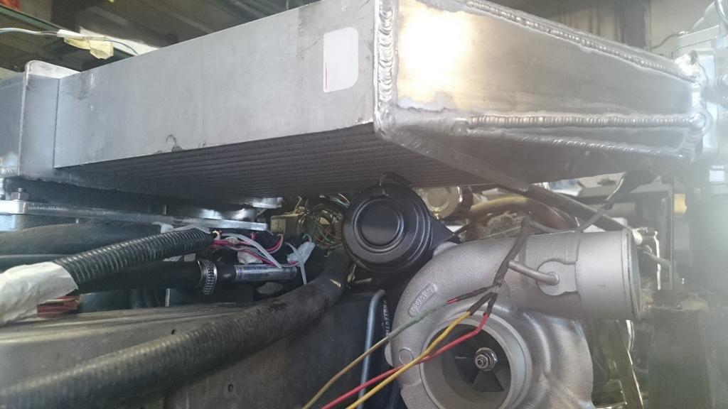 Here are a couple of other shots, not a whole lot of gap between the intercooler core and the turbo! I planned it to be that way though! You can see the stud in the middle which is missing the nut. That's the one I couldn't reach... Design flaw...