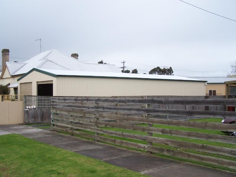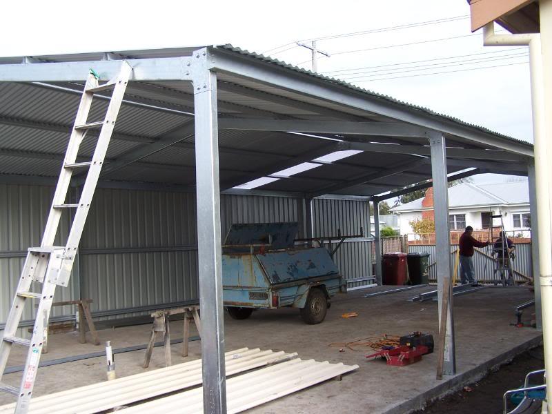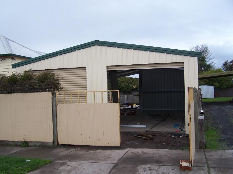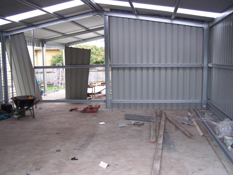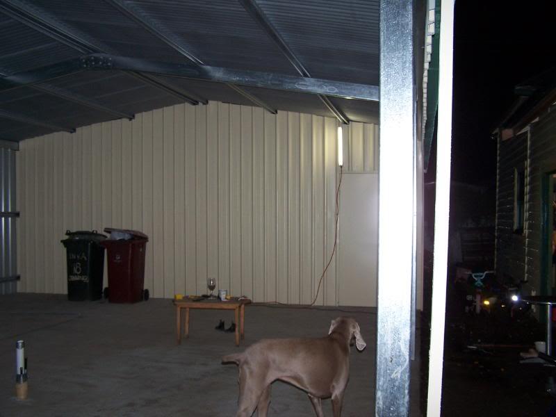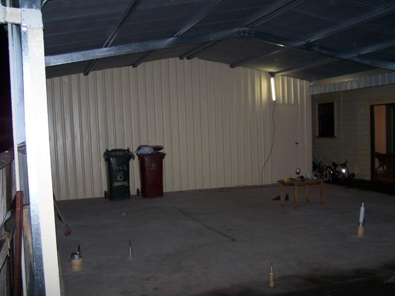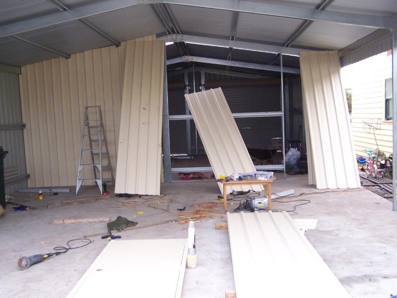 Got the roof screwed off, All the walls done aswell some uprights at the front ready to mount the roller doors. I have to go back to work tomorrow(bugger) So there won't be anything going on until tuesday.
