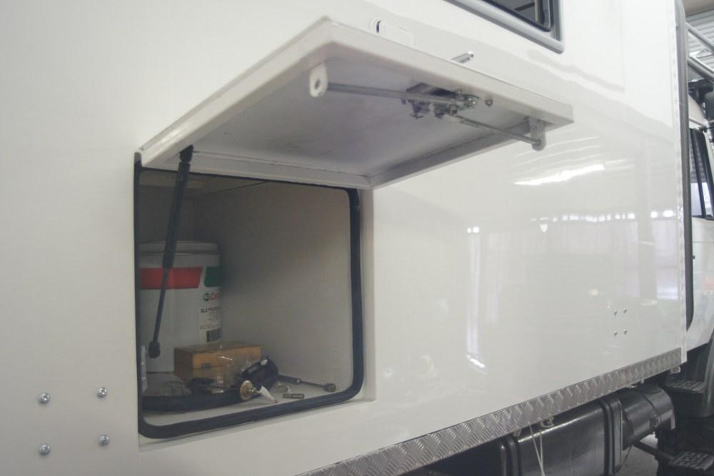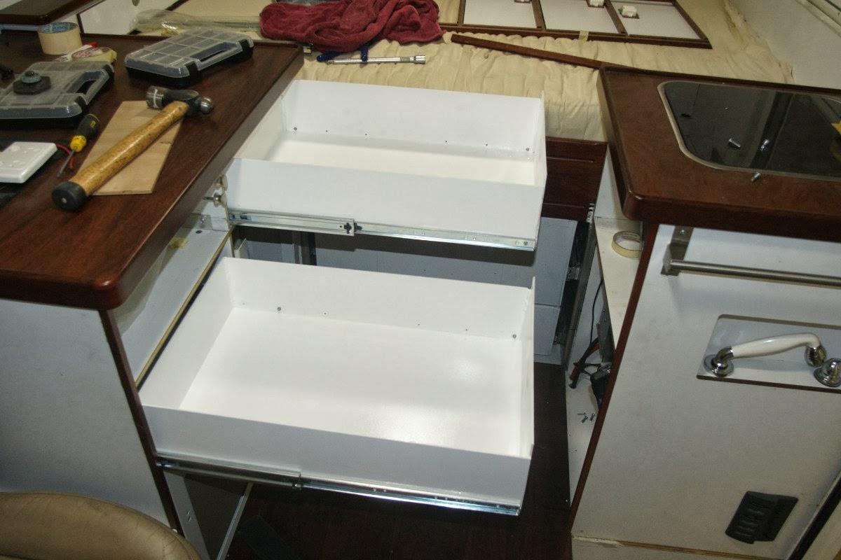 The fridge slides and all the drawers are all in, The slides have a catch mechanism that keeps the heavy fridges in place. The drawers for pots, pans etc are made from 3mm aluminium, so they can handle the load. They are pretty big, so should be able to take all the gear and the day to day food supplies.