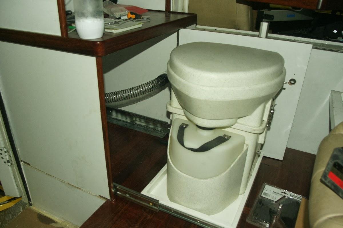 I also fitted the toilet slide and the door of the toilet, but there was a problem as the hinge is about 3mm proud of the side of the door (there is a strip to cover the edge) as the lightweight panels are only 12mm thick, and the hinge is 15mm. Unfortunately that mean the toilet slide did not work properly - hitting the hinges, so I had to reposition the toilet slide so it would work. An hour of two of repositioning and refitting, and we have a toilet. As usual, there was a problem, the little handle that you move to direct the flow to the solid or liquid containers would hit the door. So that hand had to be cut off, and a lower profile handle made that I put in the inside, out of the way. At last the whole thing was functional. Now to make the catch to hold the slide in position so it is not putting any load on the door.