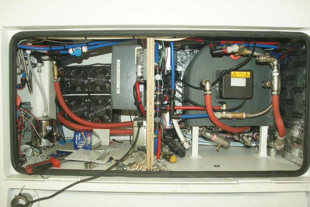 The 20 litre hot water tank is heated by the engine cooling system, or the Webasto diesel heater. The on-board cabin heater is also part of the system, with isolation valves on the heaters to block it off when it is not required. As the engine can heat the tank to over 88 degrees, I have to fit a tempering valve - that blends the very hot water from the tank with cold water to reduce the temperature down to 40-50 degrees so it doesn't burn you. Since the water in the tank gets very hot, it expands, so there is also a expansion valve to bleed the excess pressure.