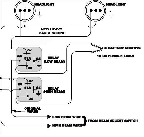 As you can see from the diagram, the existing wiring is used to drive the relays,while the relays themselves make a direct circuit between the lights and battery when the relay is triggered. I use one relay for dims, one for heads. It is possible to use a single relay with an 87a contact (SPDT switch), but the problem with this is that if you lose the relay, you lose all lights at once.