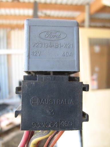 There are many ways of mounting the relays - jaycar sell relay blocks, and many relays come with a screw tab where you bolt the relay directly to the chassis, and use spade connectors to hook it up (messy, unprofessional and easy to confuse the wiring IMHO), but if you are happy to salvage parts, which I am, then the relay blocks that come with older Fords are more than suitable. They are easily mounted, take tagged spade connectors, and are modular, so if you ever need to add an additional relay, it clips on to either side.