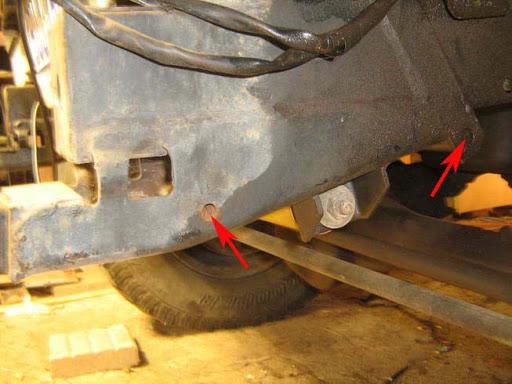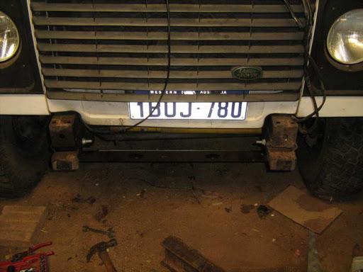 You;re going to need three high tensile bolts, at least 110mm long, bolts and washers to match. The right hand side uses two of the existing bolt holes on the chassis rails, and the steering guard has other holes drilled in it, presumably for different Defender models.