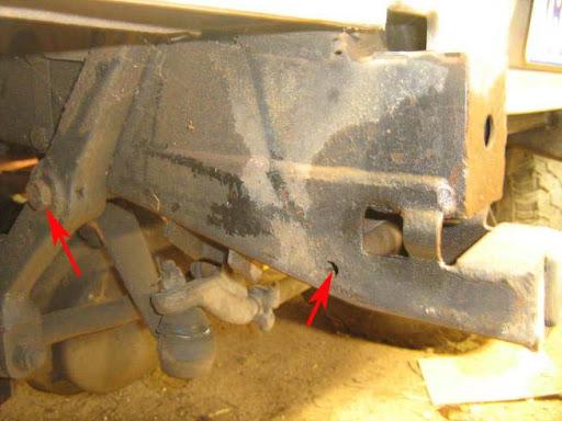 Right hand side uses one of the bolt holes on the chassis rail, and also uses the existing bolt for the panhard rod mounting arm.