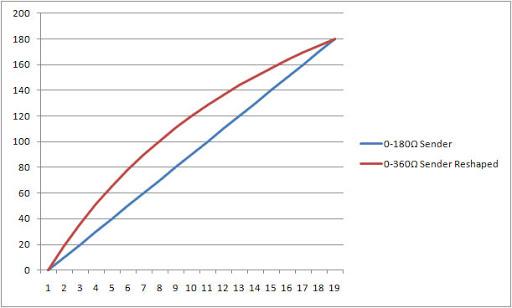 As predicted, the readings were accurate as the tank approached full or empty, but a difference of over 30 ohms exists when the tank is half full. On top of that, the error is biased towards the positive, meaning that the new VDO gauge would slowly decrease from empty, but at around the (according to the gauge) 1/4 tank level, the gauge would plummet towards empty - not the most comfortable of scenarios. To get the 10-360 sender to act like a 10-180 sender, a more complex active circuit would be required, and wouldn't be worthe the time and effort, so the option of using the stock sender was out.