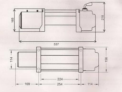 The winch dimensions, in full. I had serious trouble in getting an accurate set of measurements for the Tigerz winches - the same winch measured from 560mm to 620mm end to end depending on what you read. I've checked these with a measuring tape -they're goodIf you are mounting a winch between the chassis rails, regardless of manufacturer, these are the dimensions that you will have to work within.