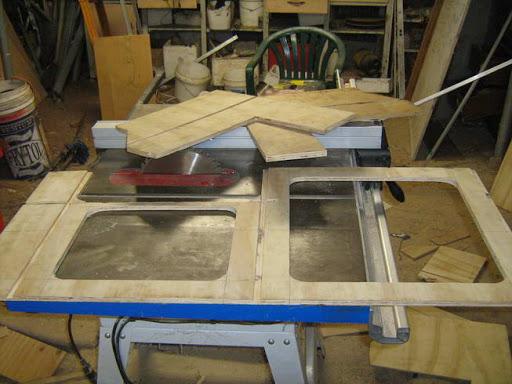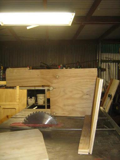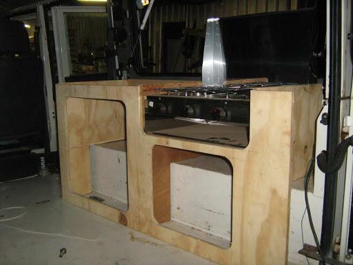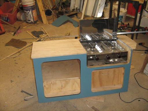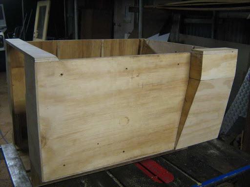 The fornt of the kitchen unit, as seen from the rear. If you have a tablesaw, then rebate everything - it adds an unbelievable amount of support. Upper left, the stove location, lower left and right, storage. Rounded corners look better, and are far more forgiving on the shins, knees, or anythign else that happens to hit them.