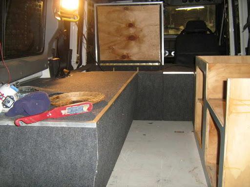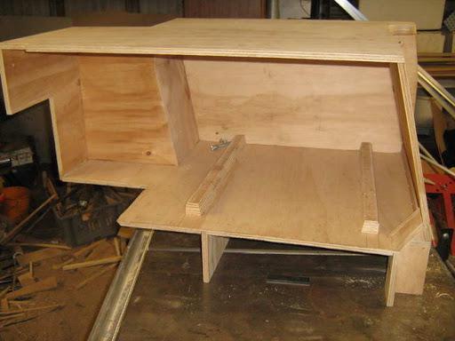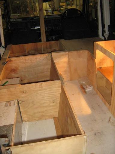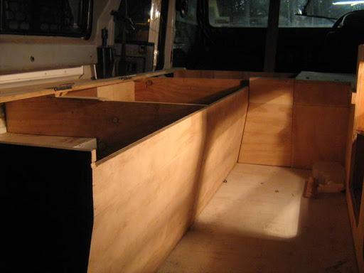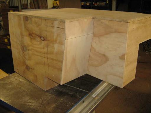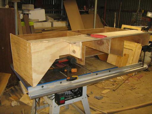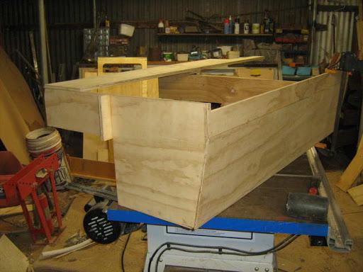 The material of choice was plywood, mainly due to a lack of any sheetbending or decent welding tools. I've seen people use 3/4 inch, sometimes even 1 inch ply for making bed bases and such, but (in my opinion), if it's braced properly and the load is distributed evenly, then 1/2" ply is more than adequate. Rather than give measurements and diagrams, I'll post photos of various stages of construction, and you can figure it out for yourself.