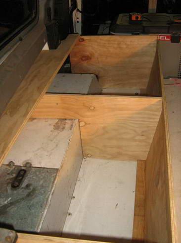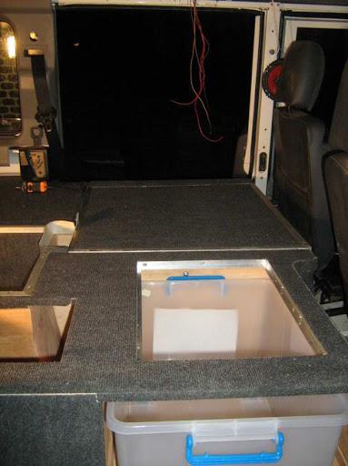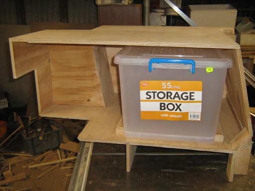 The runners on the bottom take a 55 litre storage box snugly. The box can be accessed either through the rear passender door, or through a hatch yet to be cut in the top.
