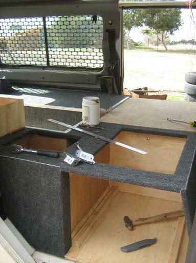 The fridge section, which sits behind the passenger seat, in what was formerly the rear passenger footwell. Again, you can figure out the basic idea from the photos, all joints are rebated for strength - the two grooves in the floor are for the feet of the fridge, and stops it from sliding around. Food can be stored in the area to the right of the fridge.