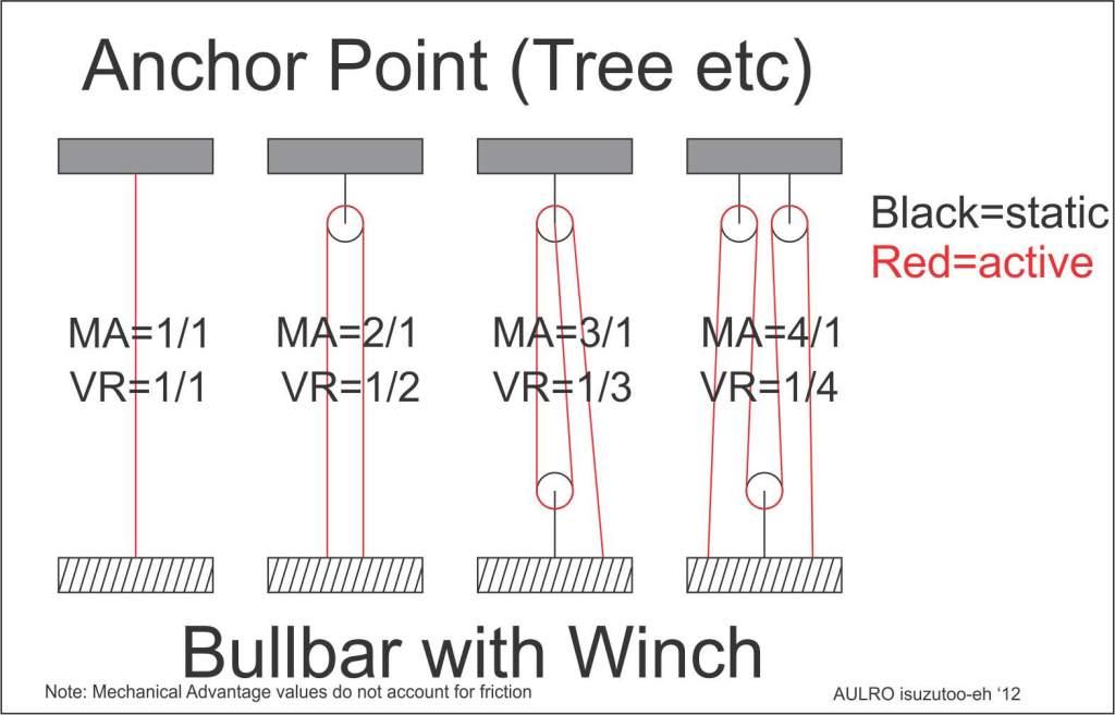 [ame="http://www.youtube.com/watch?v=zj6N7bgHxJ4"]Lewis Winch snatch block demo, huge log skid. Double the pulling power of a portable winch. - YouTube[/ame] uses a portable winch but it does again claim the MA of 2 which is wrong.
