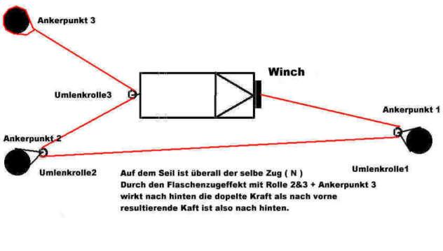 without the final block on the back of the vehicle providing at least a 2:1 the system cant work. you'd just wind up stretching the vehicle, stalling the winch or snapping something.