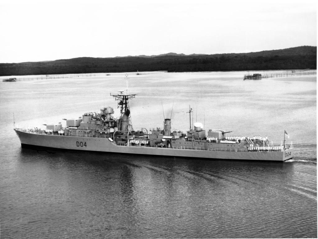 Picture taken of HMAS Voyager (II) on 27th January 1958 steamming up the Johore Strait onroute to Singapore.