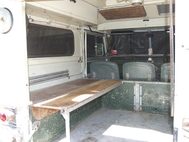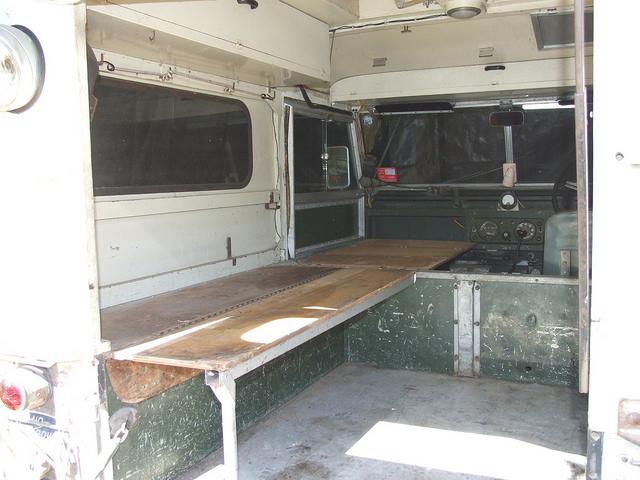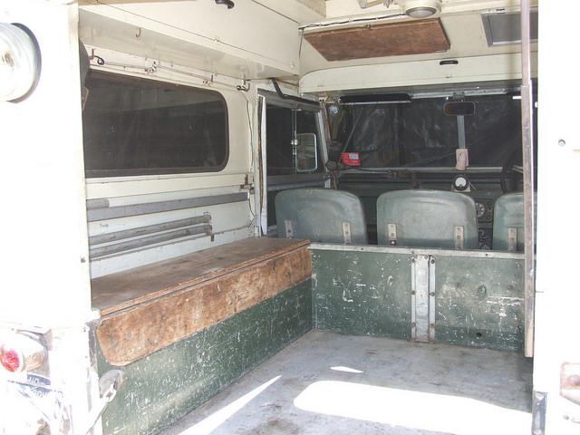 There is a bench seat down the side but the top is two sheets of plywood. Clipped to the body above the bench seat are some long brackets.