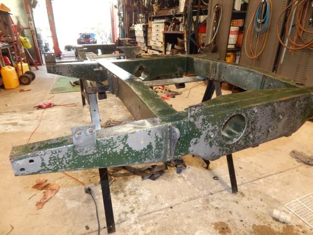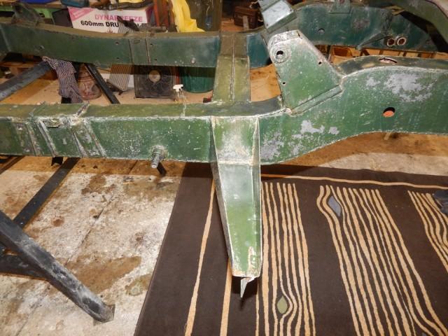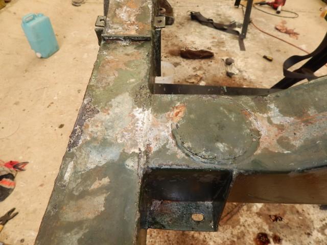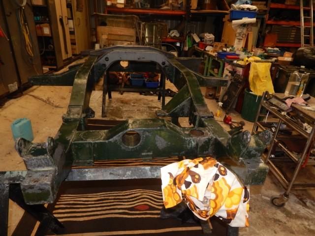 We have been scrubbing the chassis with a nylon brush and toothbrush for hard to get spots, dipped in a phosphoric solution. This process was repeated half a dozen times, the rust slowly disappears and the paint remains unaffected. We have spent at least 25 hours this week doing this - a labour of love. This is then painted with two coats POR15 Glisten, which is impervious to moisture. Painting must occur reasonably quickly as the metal blackens if left unpainted