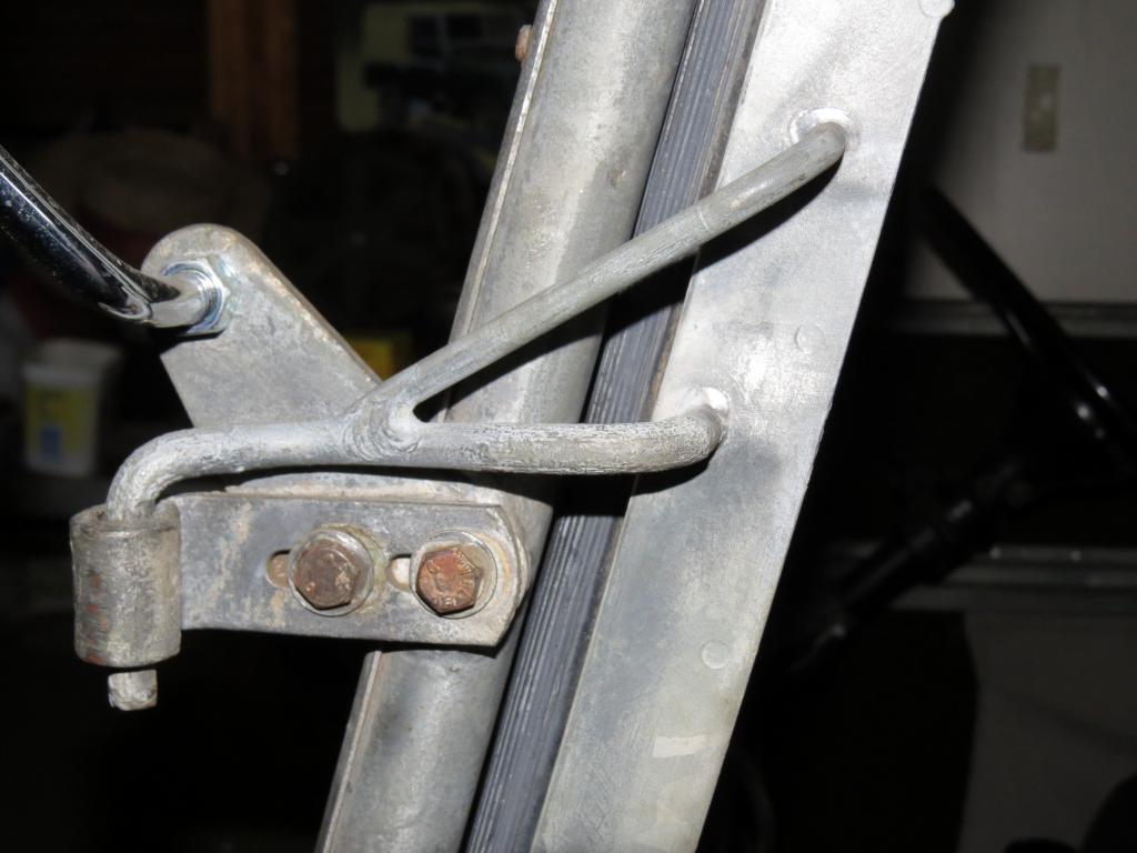 I just had a look through John Smith's book, and although none of his pictures ( except a drawing for 1951) are very clear, it seems there are at least two types. One has the bit sticking forward from the door to line up with the hinge line composed of a triangle of rods, the other is a flat triangular plate, in both cases with a short rod in a hole on a bracket attached to the windscreen frame. Both appear to be galvanised.
