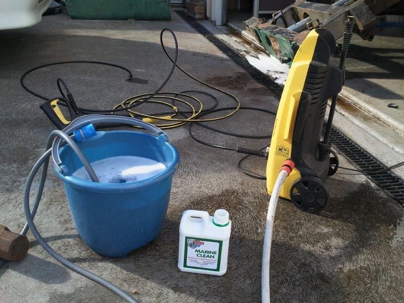 We also used a degreaser, Marine Clean, as recommended by the POR 15 people. The Karcher we have has a detergent pick up, but apparently that only works if you don't have a high pressure nozzle attached. Real useful. So we mixed the degreaser about 20:1 with water (as directed on the label) and used a short piece of hose to plumb it into the pump. Worked quite well eventually. After letting the degreaser sit for a while, we've gone back and washed it out.