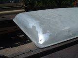 This photo shows the lid un-riveted from the base, just before I glued it back on with Sikaflex seam sealer and new pop-rivets. Unfortunately the Sikaflex went off along the front gutter before I could wipe the excess off, so it looks a bit messy.