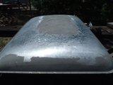 Here is the before shot. First step when beating any panel is to make sure that it is securely held by something so that the pressure exerted on the dolly doesn’t push the panel away. In this case my car ramp was the perfect size and height; I secured two pieces of 90 x 45 pine to the roof base using angle brackets, tek screws and the original mounting bolts between the roof and the cab back.