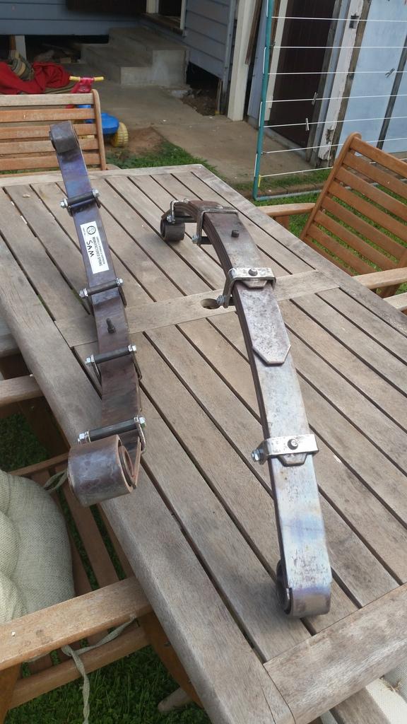 They've been cleaned up (only very light pitting) and reduced down to 5 leaves from 8. I had them re-set and tempered at Carrolls, who did a good job and were very quick. Just need painting and re-fitting with new bushes and rangie/110 shocks. I'm going to put parabolics on the front, probably Rocky Mountain as the Heystee ones seem a bit harder to get hold of.