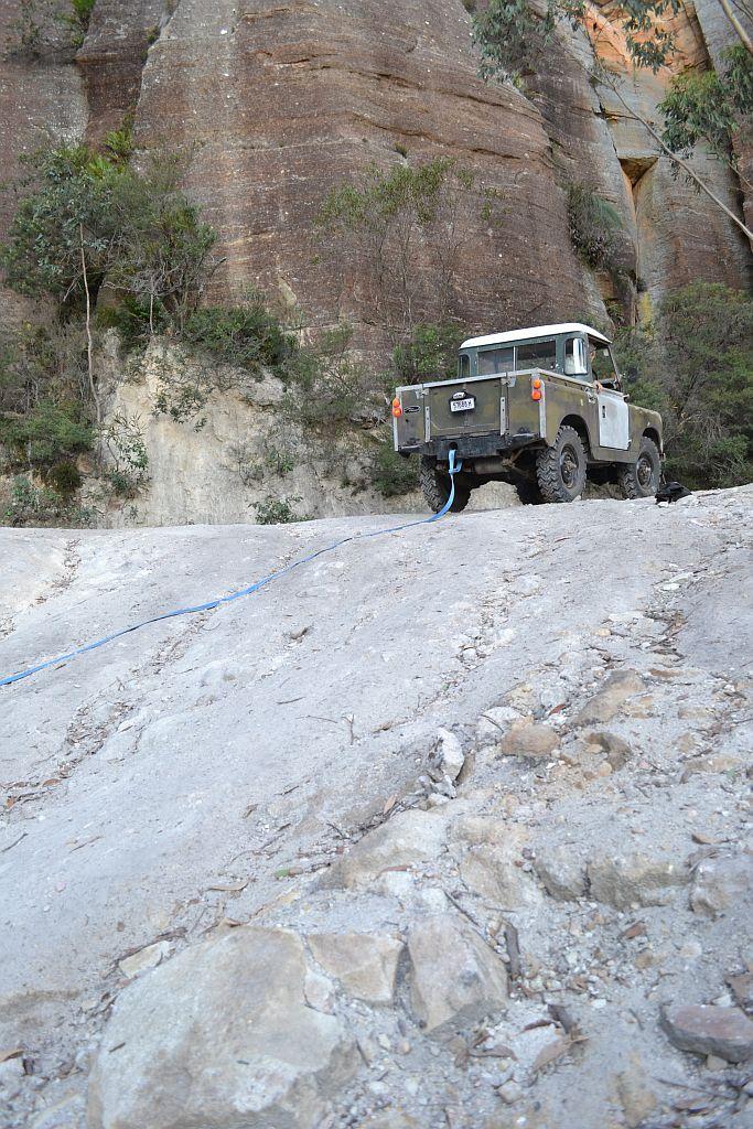 Actually, whilst manouvering into position to aid Mike, I learnt a little about leaf springs, bouncing and throttle control. I had reversed down the soft slope a little, and the hand brake wouldn't hold so I set the hand throttle to give it some revs whilst engaging the clutch and holding the foot brake on. The masses of power from the 2.25 petrol caused the wee Landy to launch in second low and scrabble around, the leaf springs caused kangaroo hops causing even more lack of traction so I felt more revs were needed. Looking back and after a bit of experimentation on similarly steep sections on Sunday, I reckon first low and idle would have let it walk up without an issue, using torque not power. The shoes have great grip even at highway pressures.
