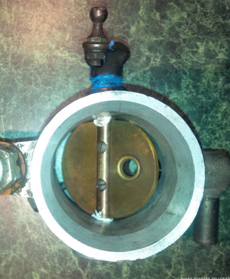 I was having a gentle fiddle, and I noticed there was a lot of free play between the brass butterfly shaft and the aluminium venturi housing. This worried me, because unfiltered air will be continually sucked into the engine through gaps between the shaft and the housing.