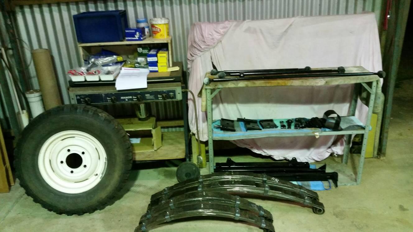 Yes a trailer shop for centre bolts or even just turn your own up if you have access to a lathe. As for the clamps they are easy enough to make and I think they are riveted on, so get some "black" rivets from an engineering shop. Ideally the clamps should have been heated to straighten them to avoid them fracturing. Places that repair agricultural machinery like vineyard cutter bars, etc. are bound to have them. If you have trouble getting them let me know as I can get some here for you.