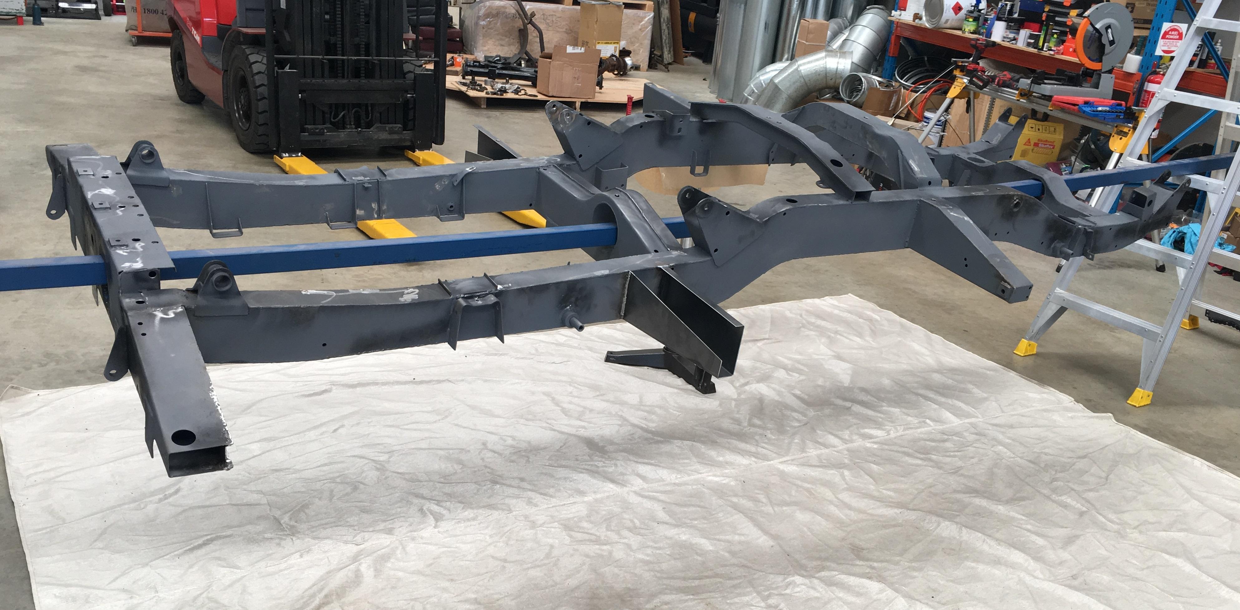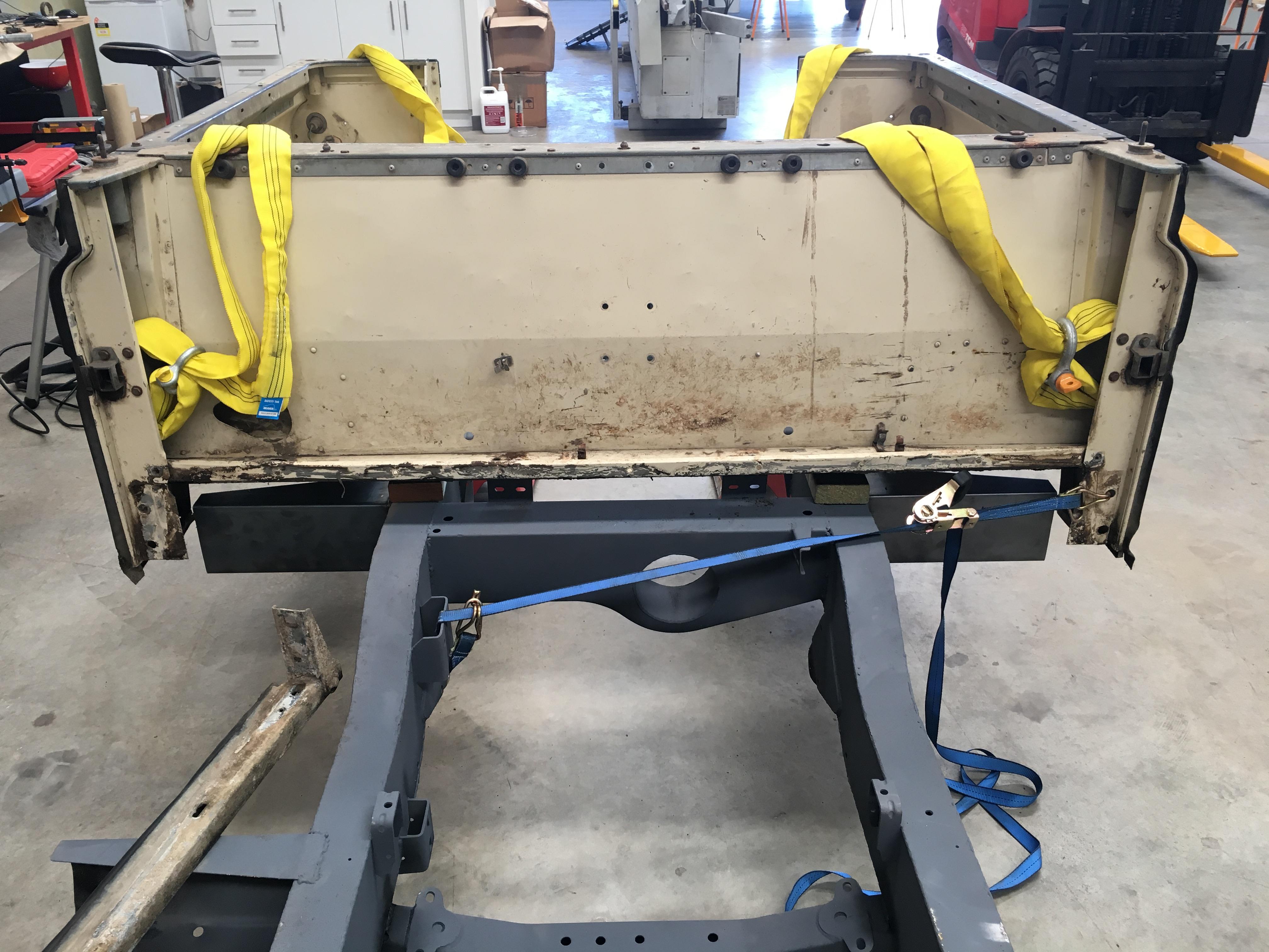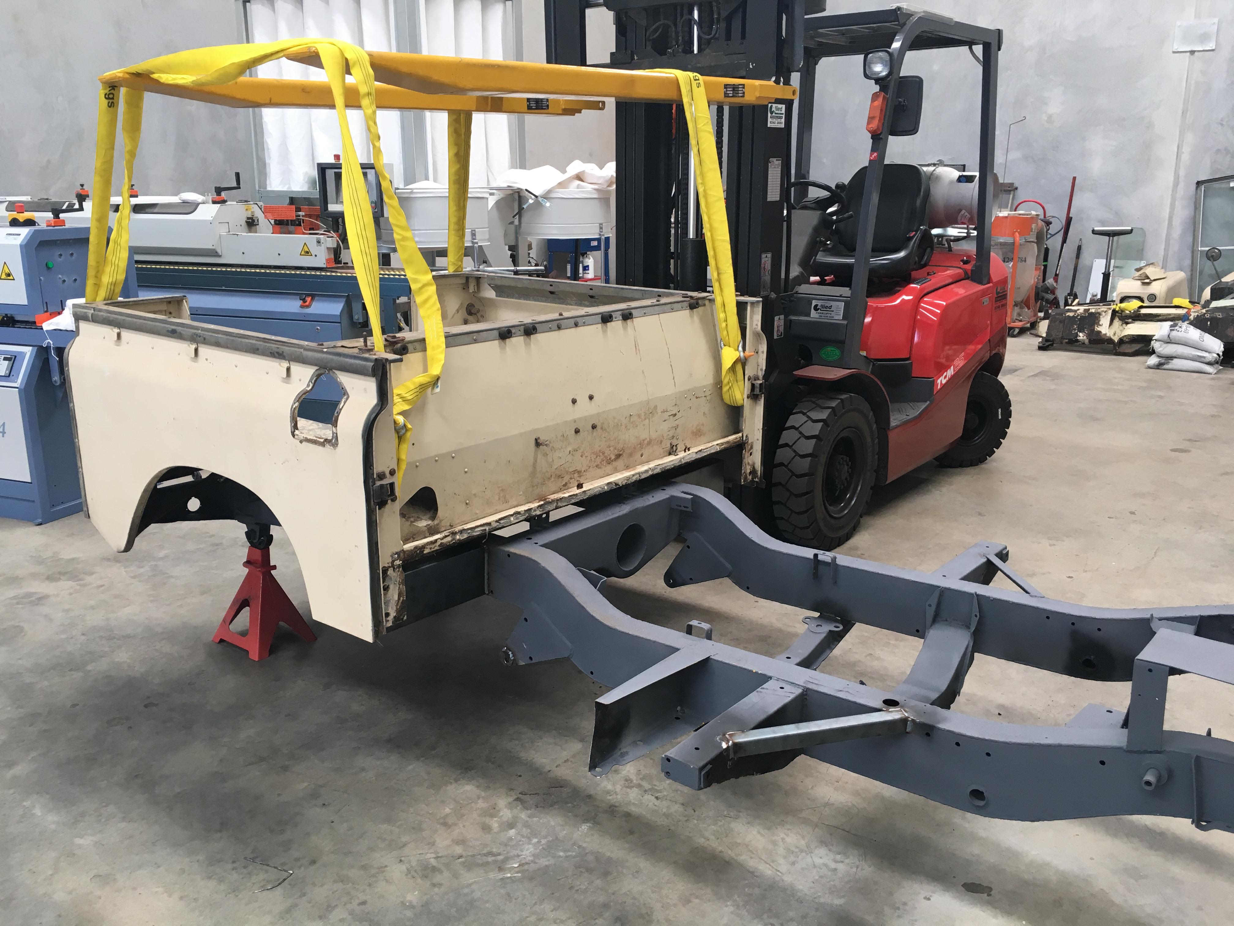 Chassis up on the "rotisserie" (which I promptly had to move because I needed to unload a truck, and of course the forklift was behind it)