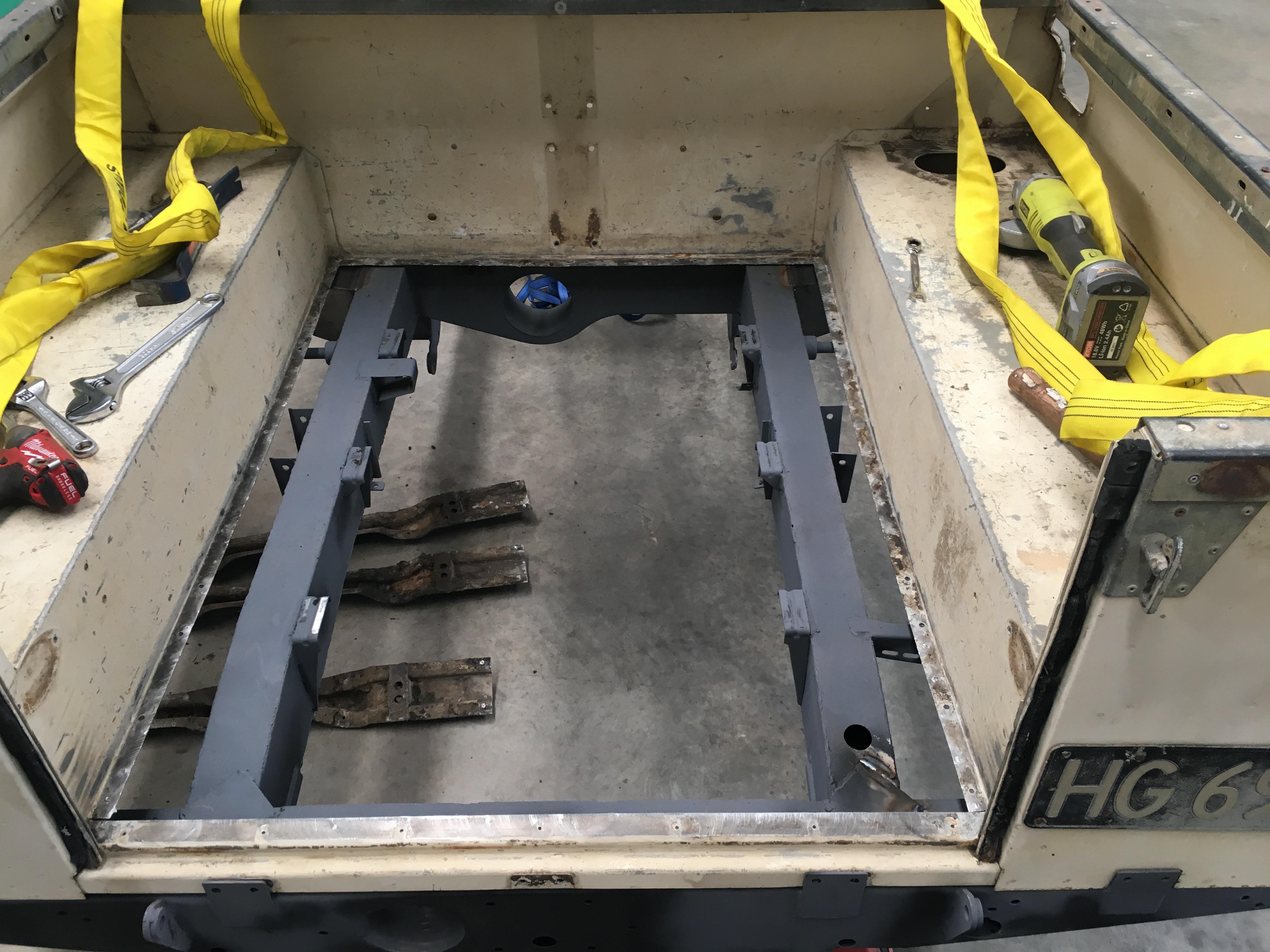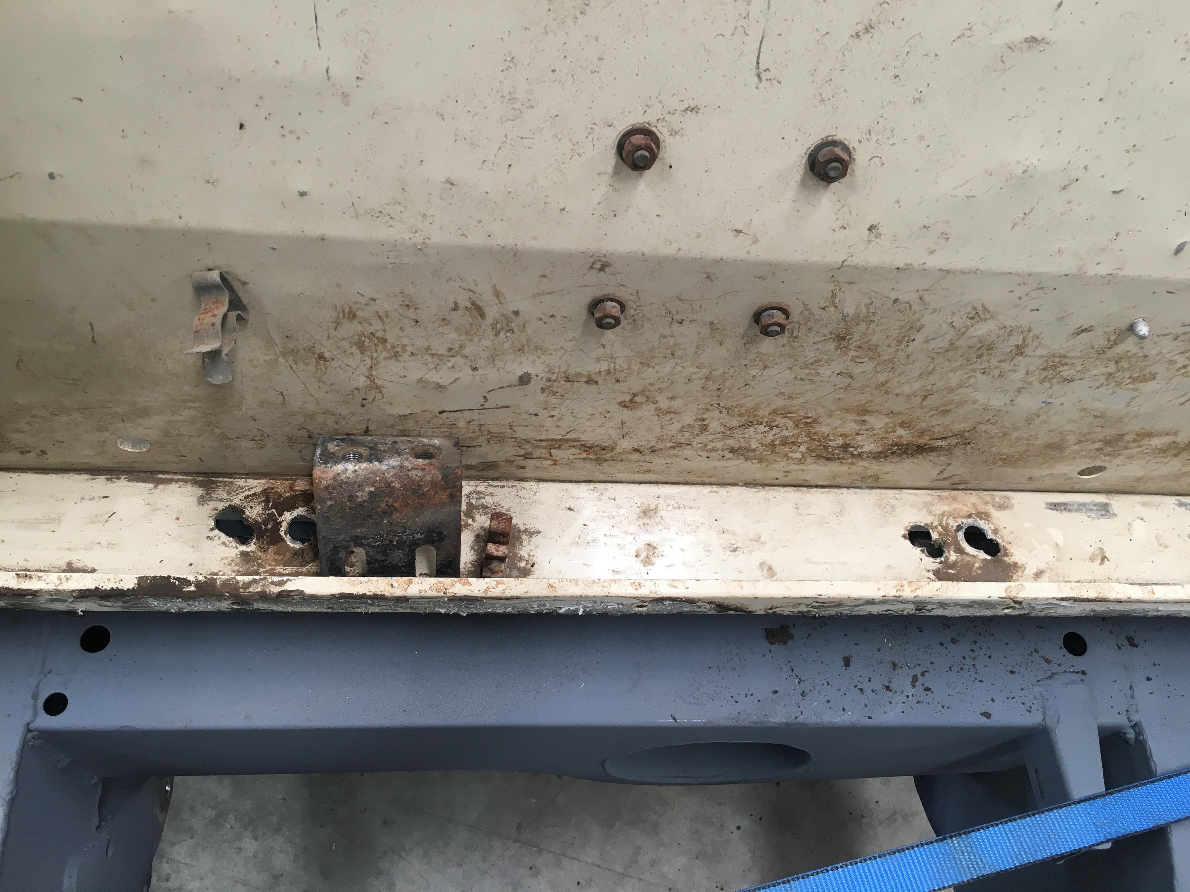 I was wondering if I was going to get away without removing the floor, buy there are a couple of heavy dents in it, and the braces underneath have corroded where they contact the galvanised cross braces. After removing the floor the tub had relaxed/unsprung itself and was now centred on the chassis again.